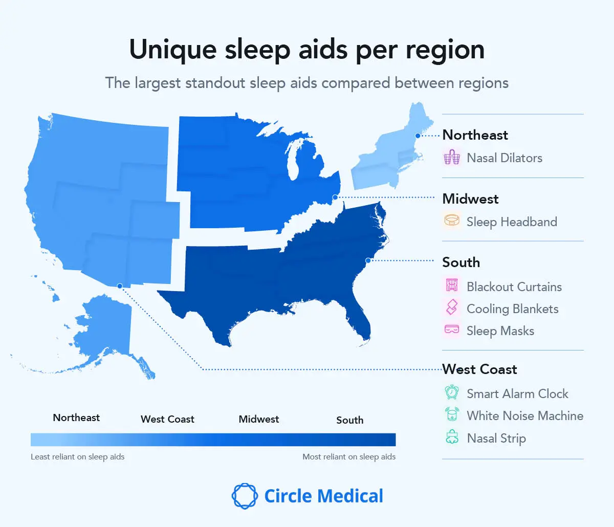 Regionally, the South shows the most overall interest in sleep aids across the board (34.2%), particularly in products like blackout curtains and cooling blankets, likely influenced by heat and bright light disrupting sleep. In the Midwest (31.4% overall), sleep headbands have emerged as a uniquely popular product, especially in a region known for cold winters. The West Coast (27.9% overall), unsurprisingly, leans more toward tech-based tools like smart alarm clocks and white noise machines. The Northeast, meanwhile, shows more modest interest overall (27.4%), with slight preference for nasal aids, perhaps due to seasonal congestion or air quality concerns.