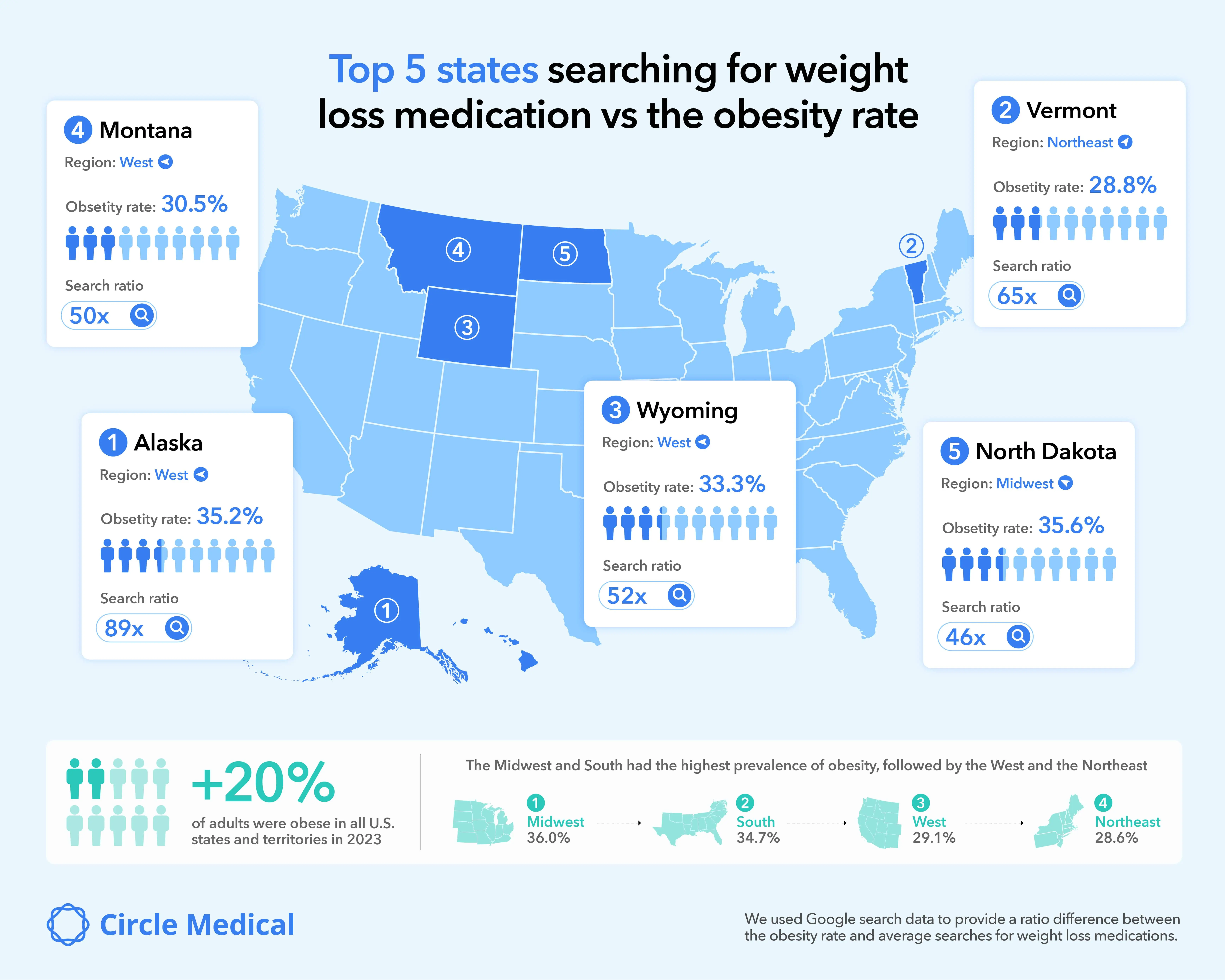 For example, states like Alaska, Vermont, and Montana - with obesity rates between 28% and 35% - show search interest up to 88 times higher than expected based on their population and obesity levels. Meanwhile, states like Texas, Illinois, and Virginia - where obesity rates reach 36% - show minimal interest.